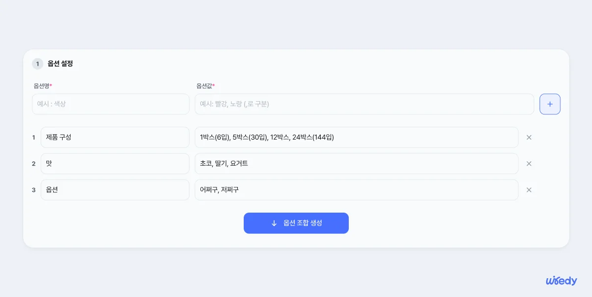 실제 판매가 이루어지는 상품의 옵션명과 옵션값을 작성해주세요. 기입해주시는 옵션과 옵션값에 따라 옵션 조합을 자동으로 생성해드려요. 옵션 종류가 다양할 수록 스마트스토어 가격 등록 도우미의 자동 계산 서비스의 활용도가 높아져요!