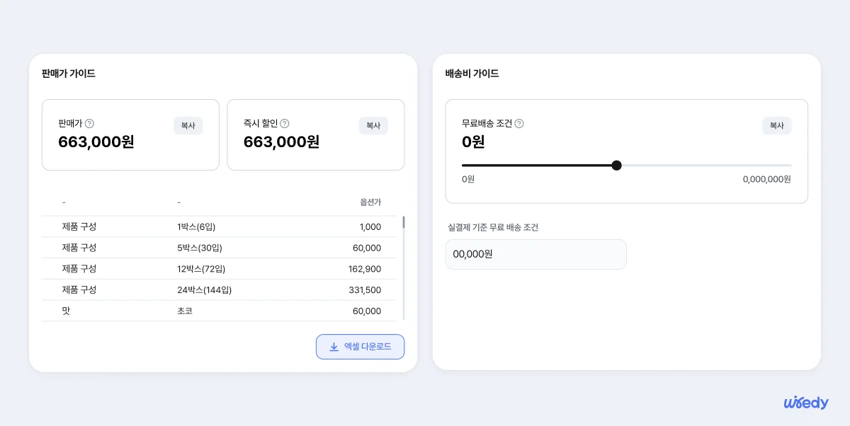 옵션별 가격 기재가 끝나면 판매가 계산 버튼을 클릭해보세요! 기입한 내용을 바탕으로 판매가와 즉시 할인 금액, 각 옵션가를 와이어디가 자동으로 계산해줍니다. 옵션별 가격 셋팅은 엑셀 파일을 다운 받아 그대로 스마트스토어에서 일괄 등록할 수 있도록, 엑셀 다운로드 기능도 지원해드리고 있어요.