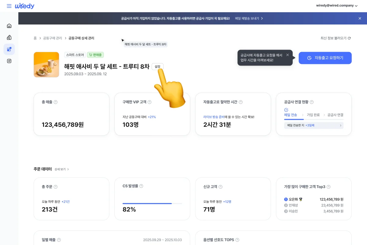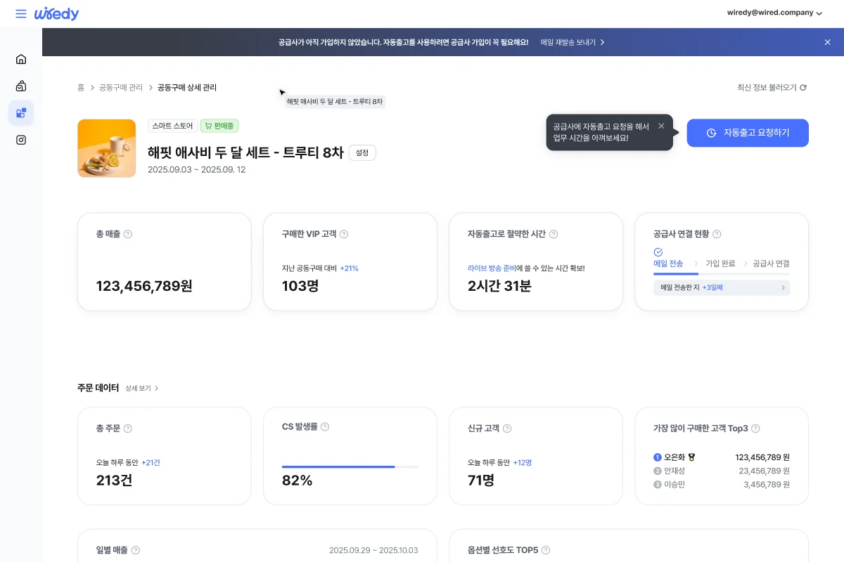 와이어디에서는 판매 페이지 연동만 하면, 공동구매 진행 전부터 마감까지 하나의 페이지에서 관리를 진행할 수 있도록 서비스를 제공하고 있습니다. 옵션별 판매 현황부터 실시간 매출, 신규 고객 유입 수, 최다 구매 고객 등 꼭 필요한 데이터가 한 곳에 모여요.
