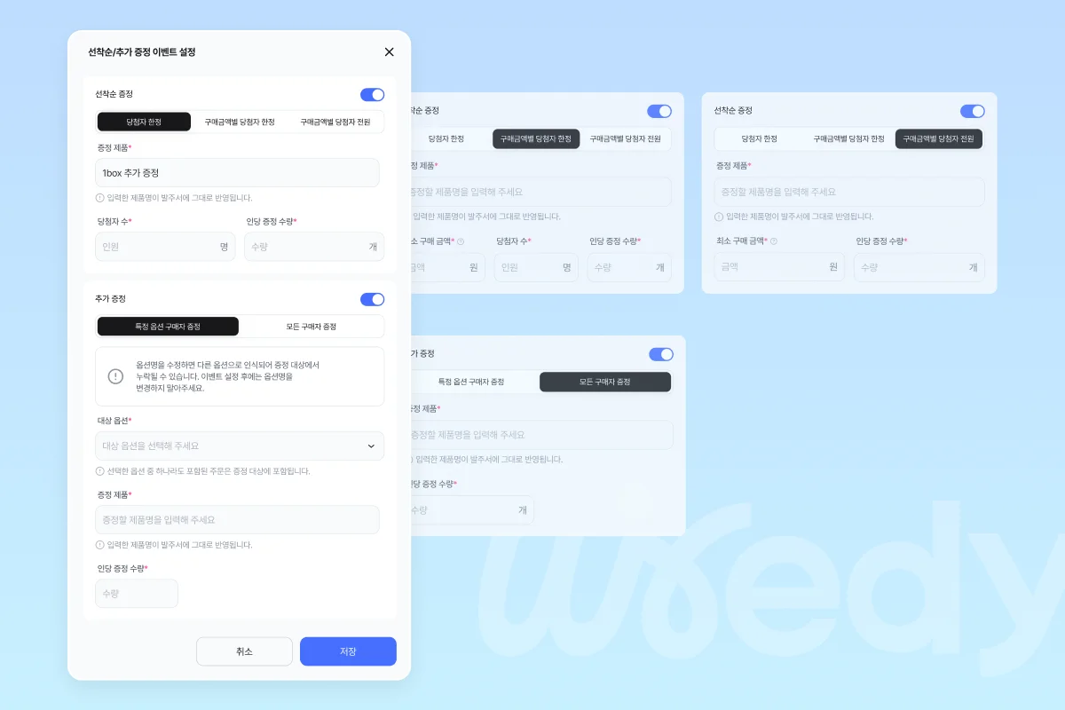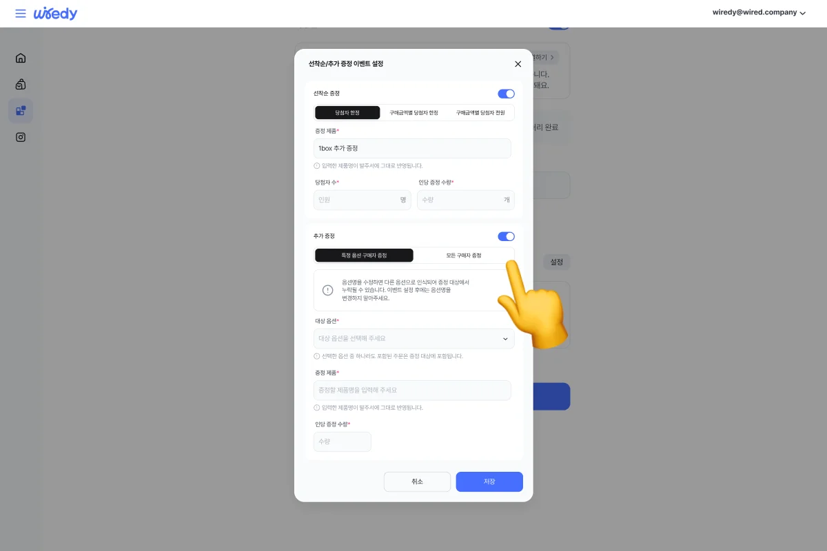 ③ 이벤트에 따라 선착순 증정, 추가 증정을 선택한 뒤 값을 기입한 후 저장 버튼 클릭