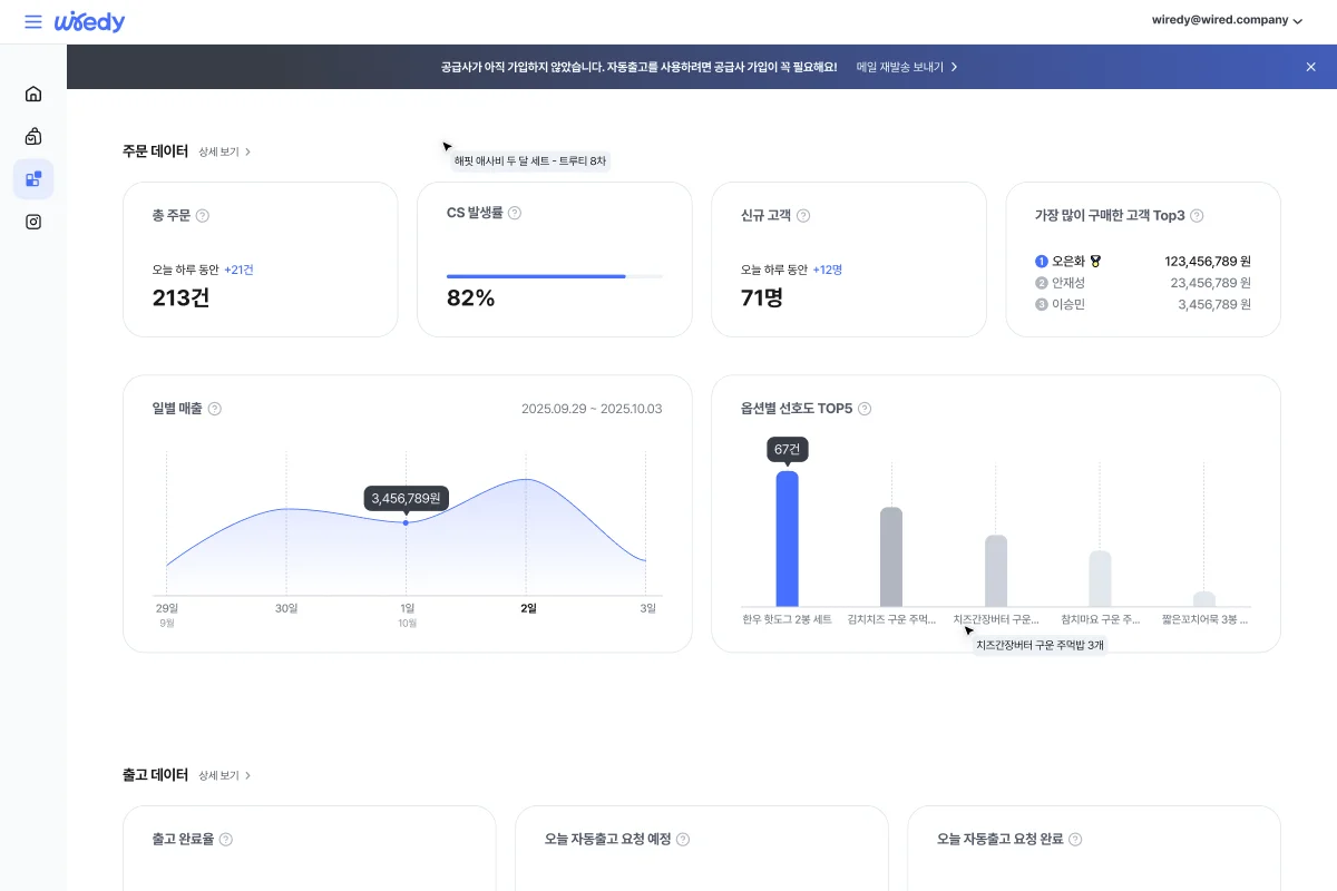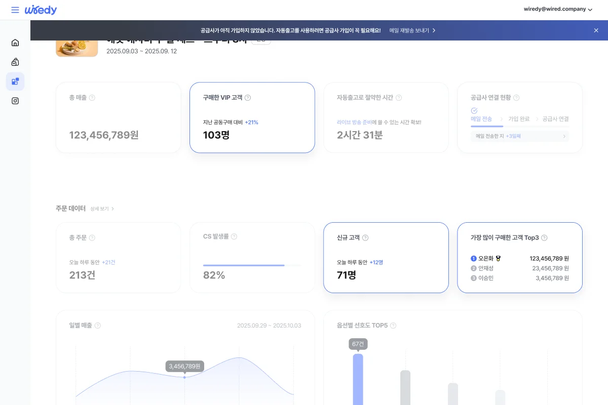 와이어디에서는 이번 개편을 통해 하루 24시간이 부족한 셀러분들을 위해 고객 관리 데이터도 함께 제공합니다. 신규 구매자 수, VIP 고객 증감, 최다 구매 고객 같은 핵심 지표를 마켓별로 보기 쉬운 카드 형태로 정리해줘요. 별도의 엑셀이나 데이터 작업 없이도 판매 페이지 연동 한 번이면 자동으로 집계되기 때문에, 공동구매 마감 이후에 고객 증감 추이 파악, CRM 액션 설계, 다음 콘텐츠 기획까지 바로 이어갈 수 있습니다.